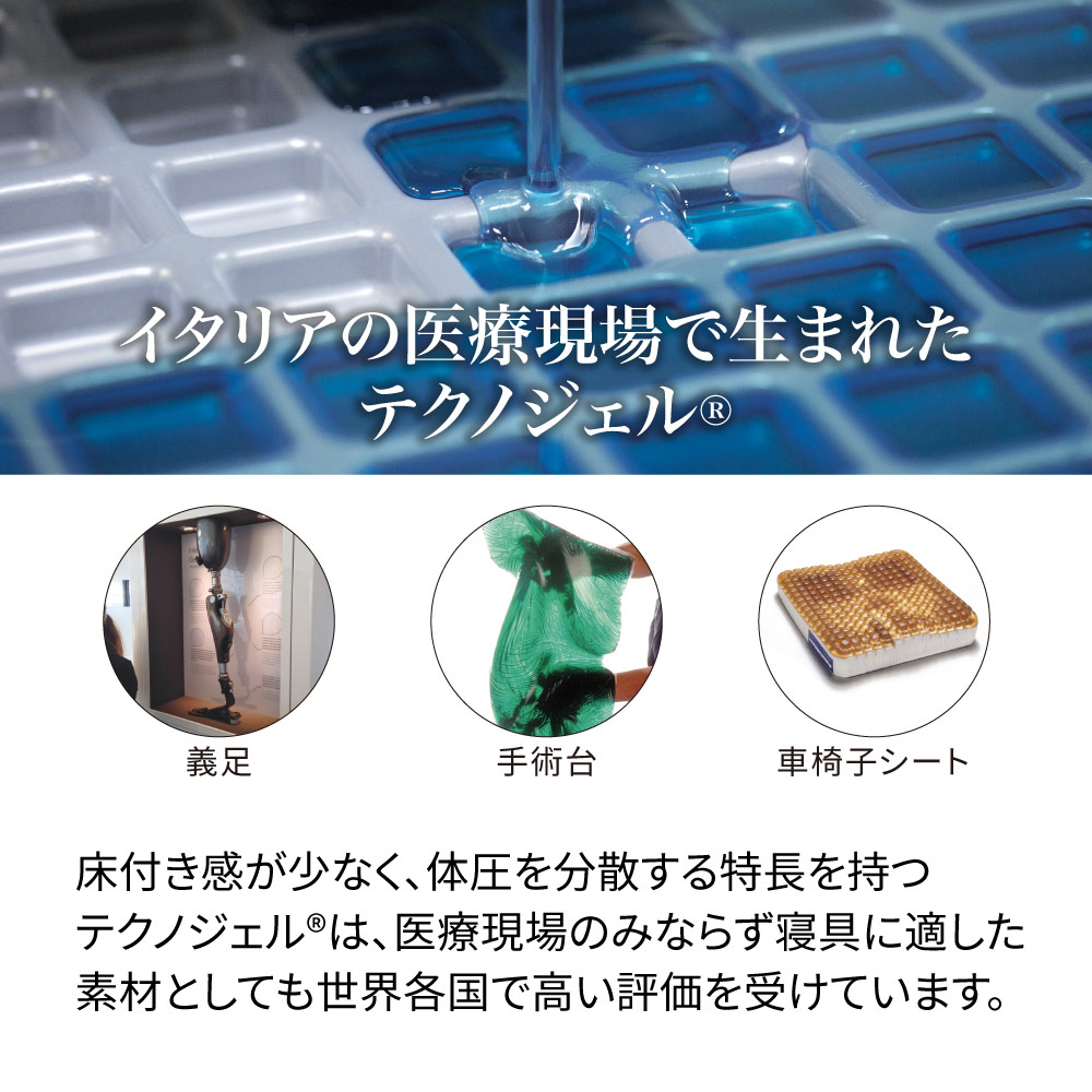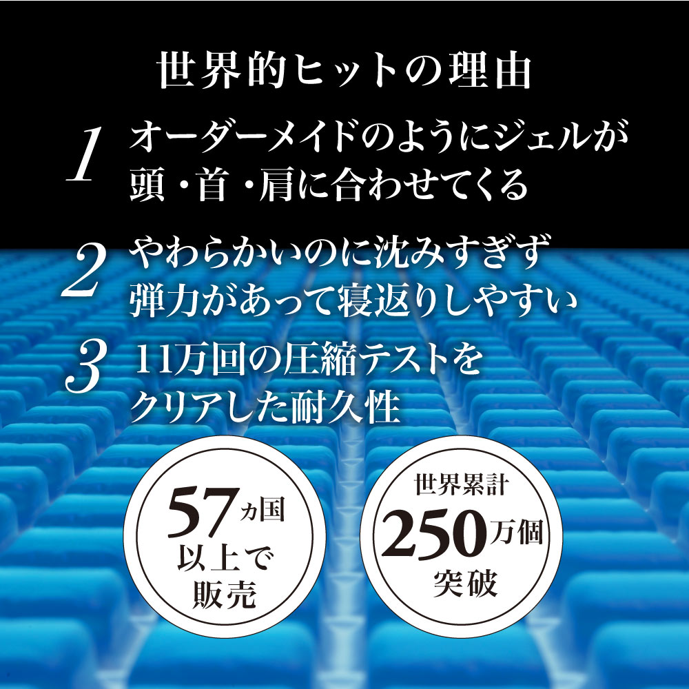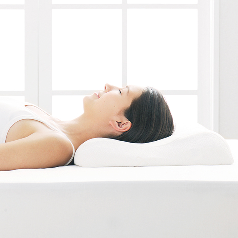 頭を乗せた瞬間に、まるでオーダーメイド枕のように使う人の身体にフィットし支えてくれる。その秘密はイタリアの医療現場で生まれた特殊なジェルの働き。やわらかいのに沈み込みすぎない弾力と高い体圧分散性で、睡眠中の動きに追随しながら頭部から首・肩までをサポートします。合う枕が見つからない、首や肩がつらいという方にもぜひお試しいただきたい枕です。
