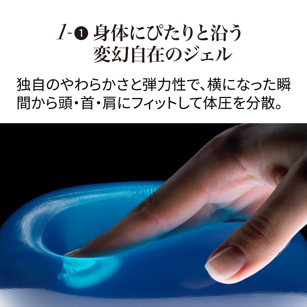 人体に寄り添うゆるやかなカーブ形状。頭・首・肩を支えるエリアにジェルを敷き詰め、どんな寝姿勢でも心地よく。