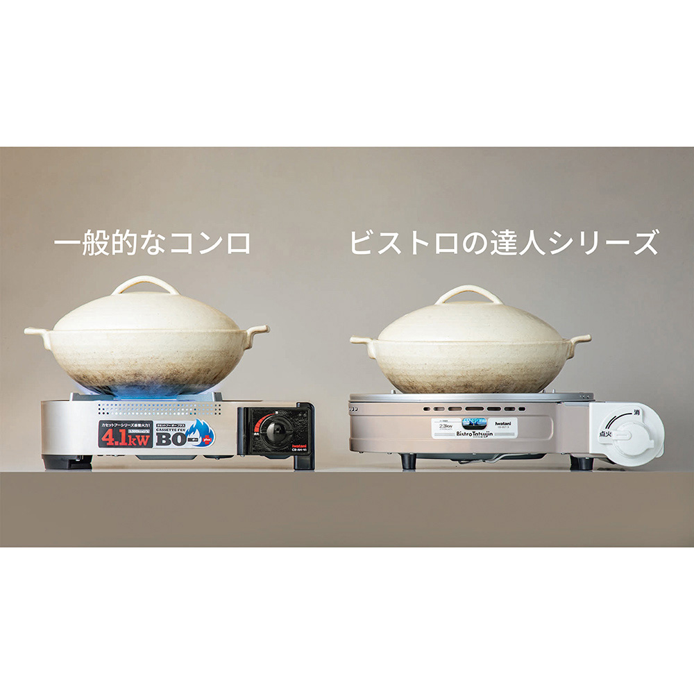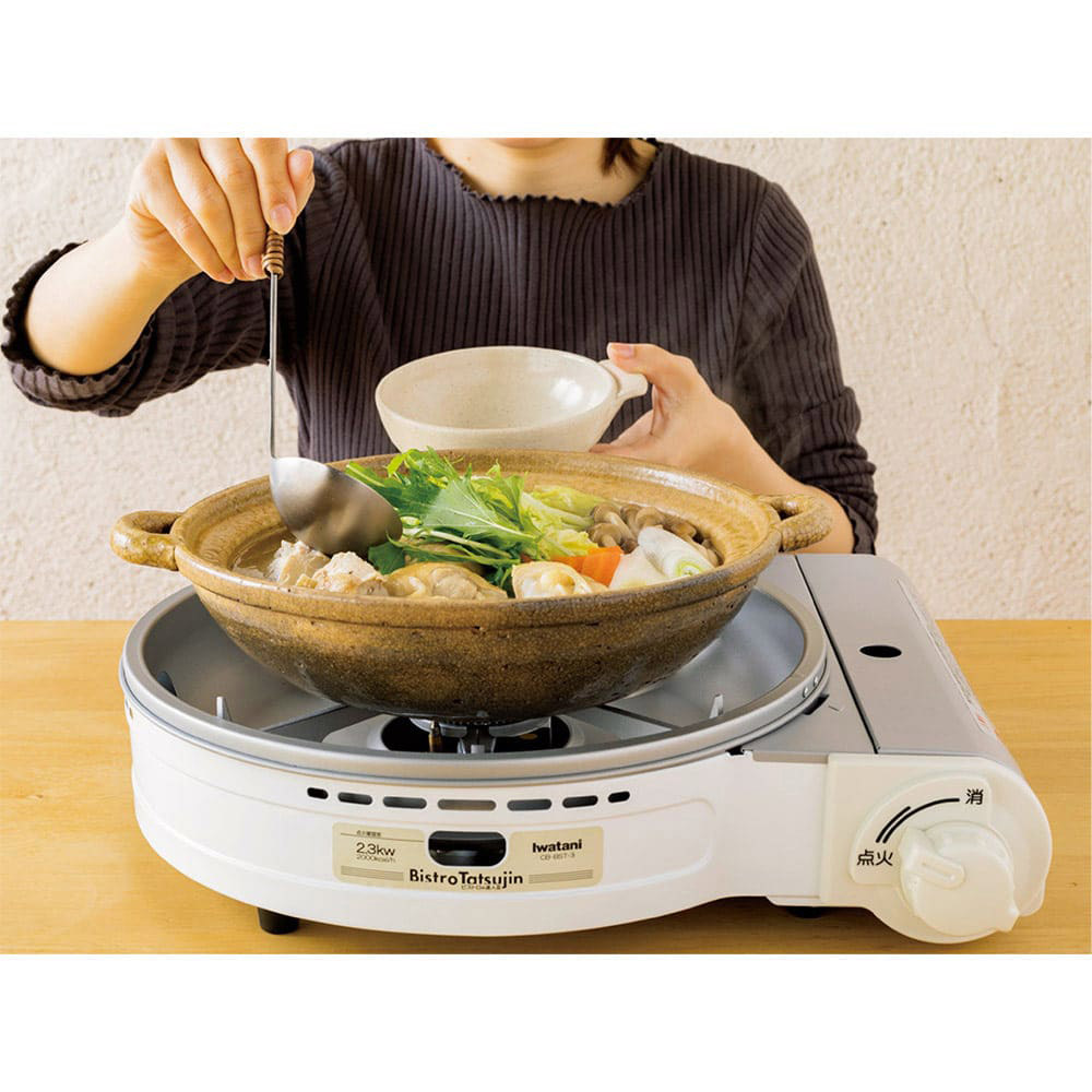お手持ちの土鍋を置いても炎がむき出しにならず、安心して鍋を楽しめます。火力は側面の小窓から確認可能。熱源が覆われているため、風のある屋外でも火が消えにくいのも特徴です。 ※画像は従来品の「ビストロの達人3」です。