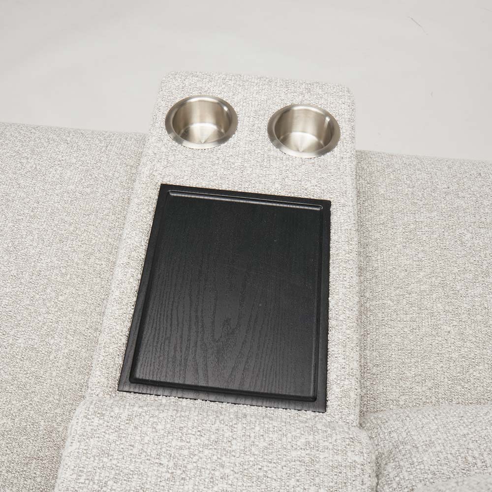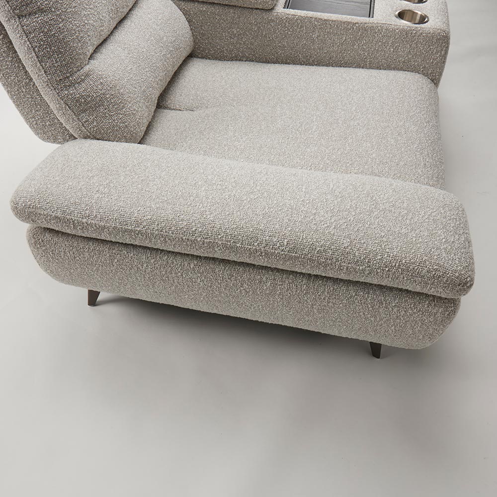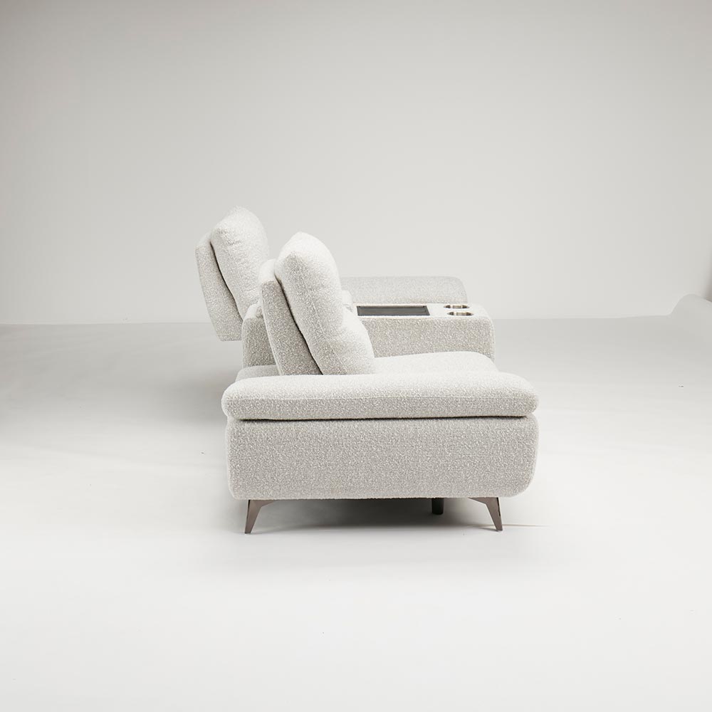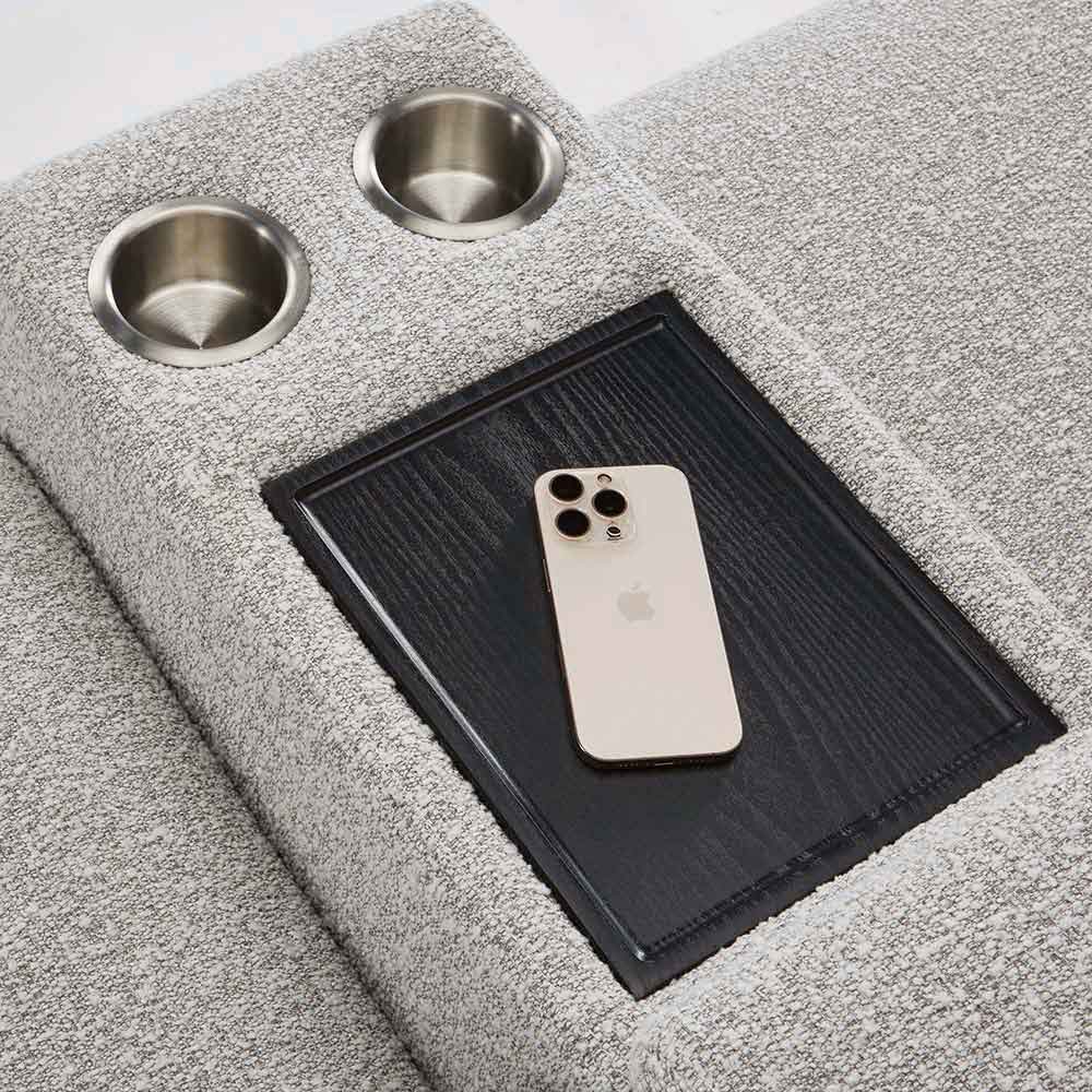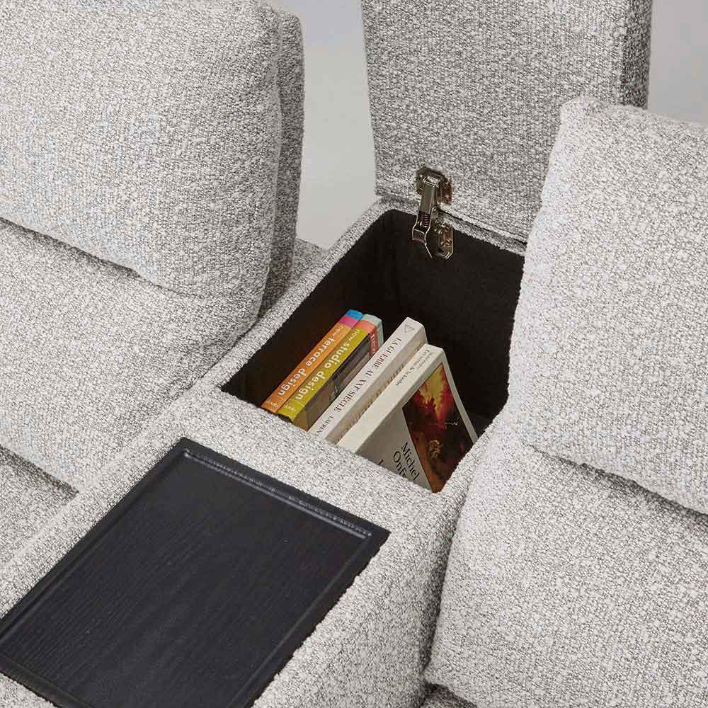 まるでシアタールームにいるかのような気持ちにさせてくれるソファには、センターテーブルがついています。センターテーブルの後方にはコンパクトな収納庫がついています。お気に入りの本などをしまっておくのに便利です。テーブルは使いやすいちょうど良い大きさで、前方にはカップホルダーがついています。HOUSE STYLINGストア限定のソファ