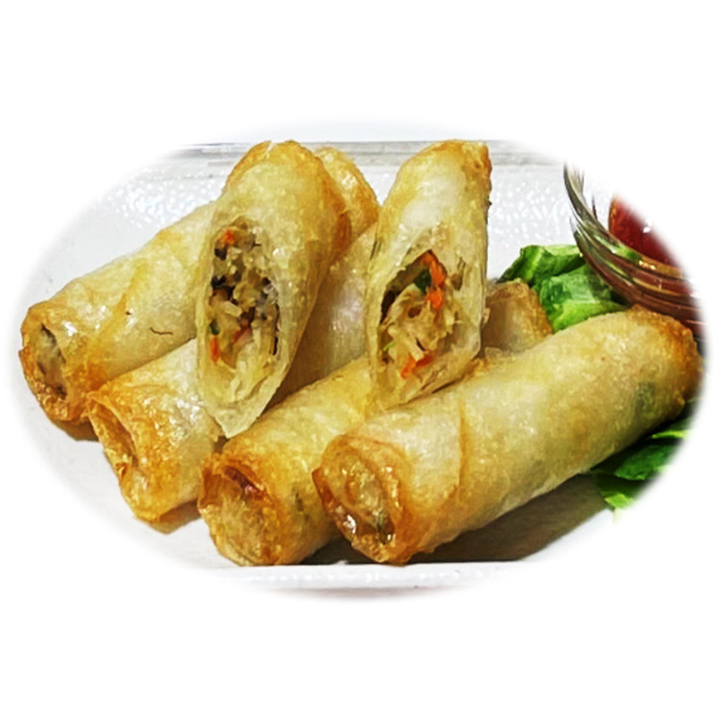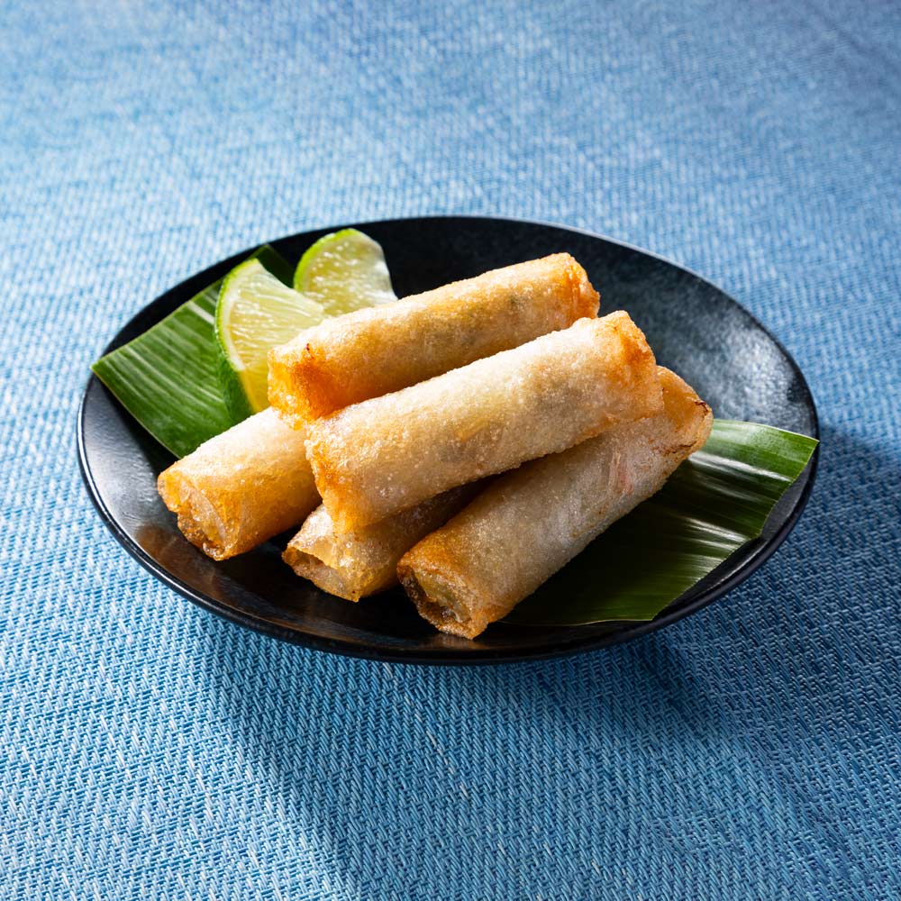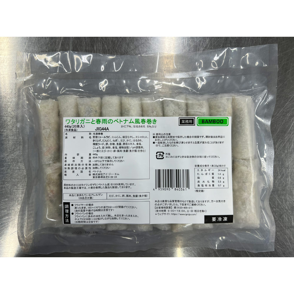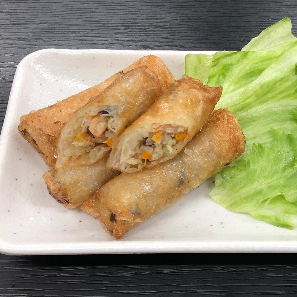 ライスペーパーを使った本格的なベトナム風の揚げ春巻きです。7種類の野菜と春雨、そしてベトナム産のワタリガニ(タイワンガザミ)と海老が入っています。エスニックな風味と、ライスペーパーの歯ごたえが食欲をそそります。《具だくさんでボリューム満点のエスニック春巻き》