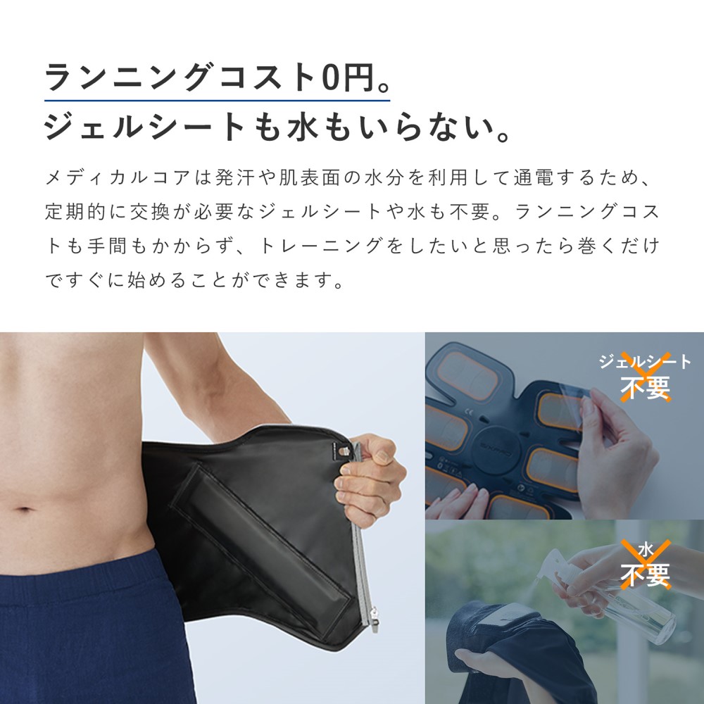 メディカルコアは発汗や肌表面の水分を利用して通電するため、定期的に交換が必要なジェルシートや水も不要。ランニングコストも手間もかからず、トレーニングをしたいと思ったら巻くだけですぐに始めることができます。商品画像の説明