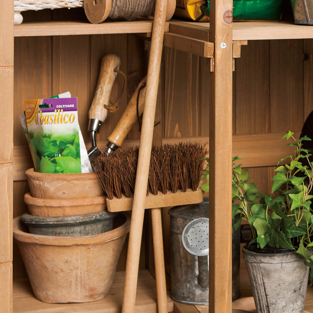 しっかりある奥行きと段違い可動棚で、散らかりがちなガーデニング用品やツールをすっきりまとめられる収納庫。あたたかみのある天然木が庭となじみます。暗くなると自動点灯するソーラーランタン付きが登場。