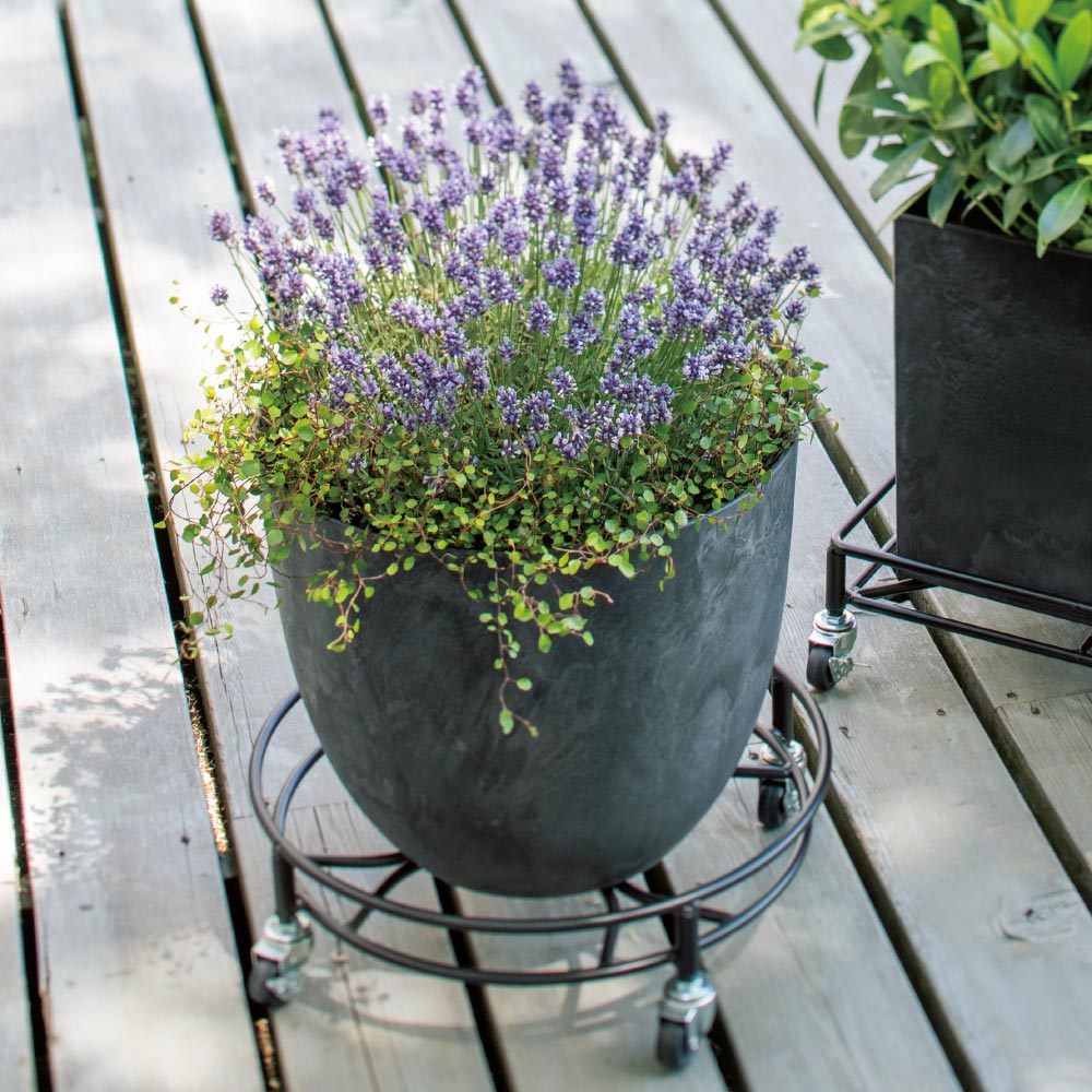 ストーンパウダーを混ぜ込んだ樹脂製。素材感たっぷりなのに、片手でひょいっと持ち上げられるほどの軽さ。テラコッタ風のブラウンは暖色系の花や明るい色のリーフと、グレーは寒色系の花やオリーブなどの木とマッチします。【頑丈アイアンキャスター付き鉢台】