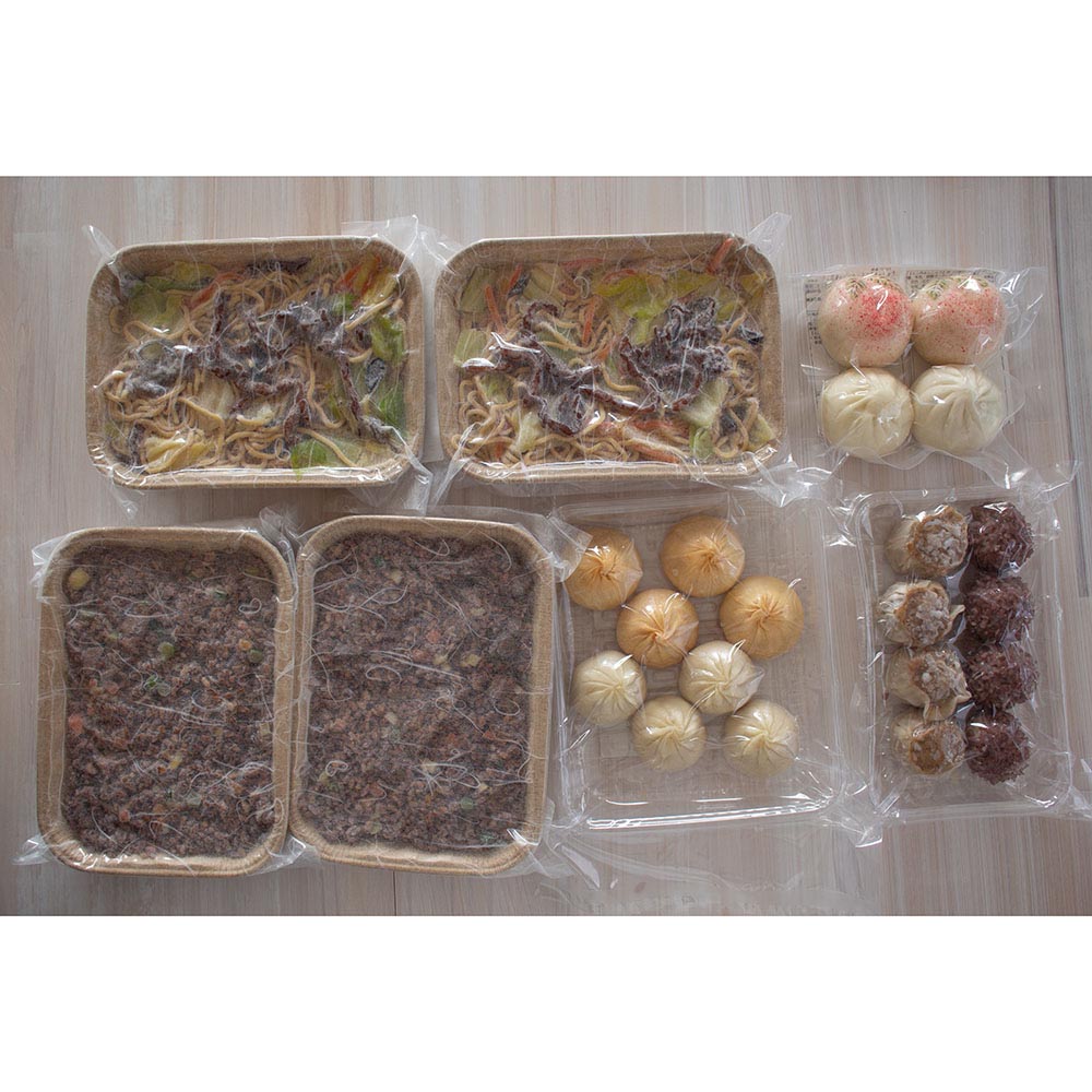 ■内容量:【上海焼き小籠包】28g×4個 【海老ミソ焼き小籠包】28g×4個【肉焼売】35g×4個【紫糯米焼売】30g x4個【黒醤油炒飯】270g×2個【上海焼きそば】270g×2個【ミニ肉まんじゅう】40g×2個、【ミニ桃まんじゅう】40g×2個