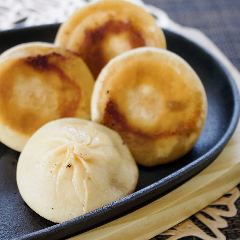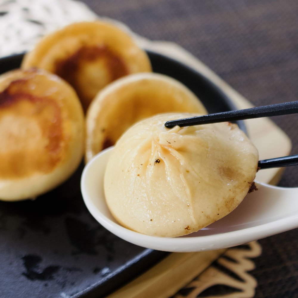 冷蔵解凍後、フライパンに油を引き、焼き小籠包を並べ約30ccの水を注ぎ蓋をして弱火で約5分程蒸し焼きにします。小籠包の生地が膨らんで底に焼目がついたら完成です。 水分が残っていたら火力を強くして飛ばすか、余分な水分を捨ててから焼き上げて下さい。