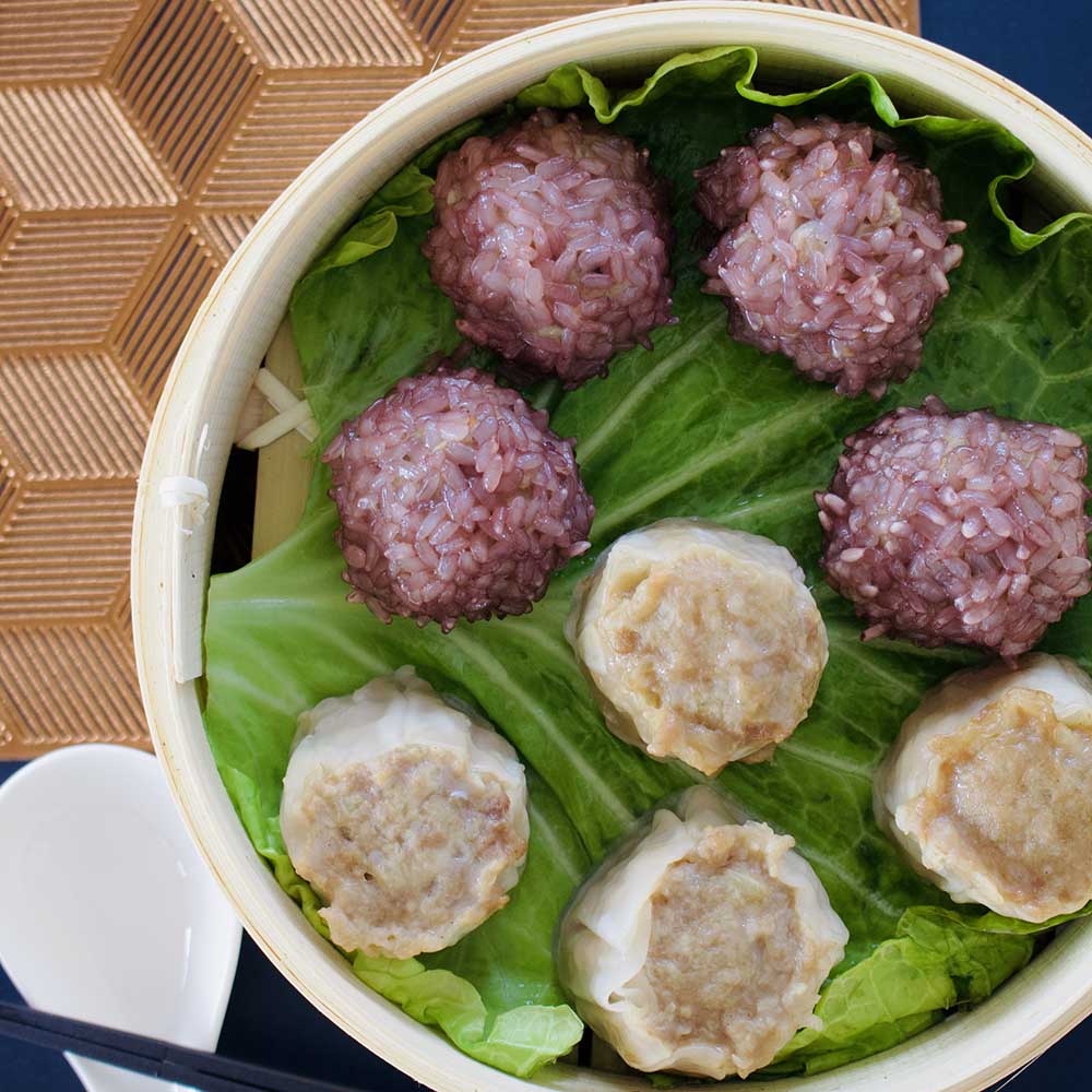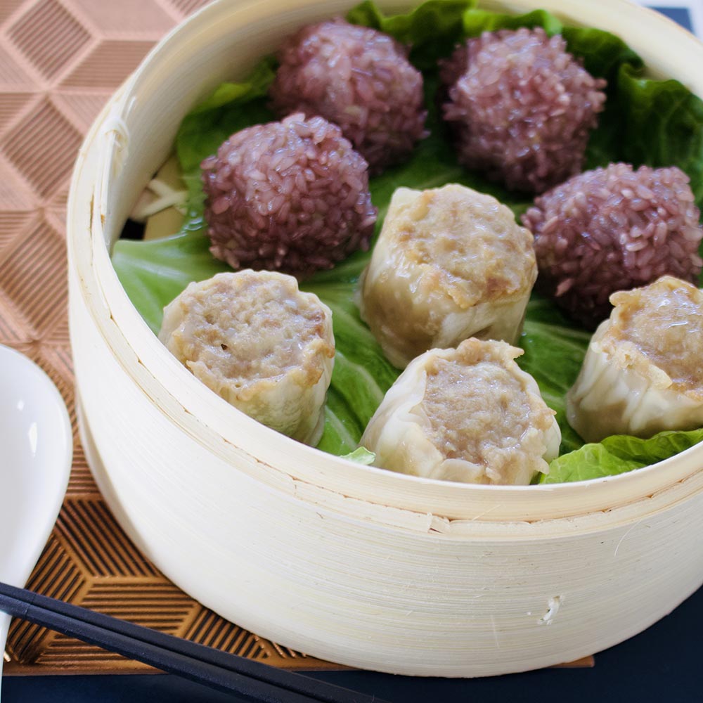 下【肉焼売】・上【紫糯米焼売】調理例・盛り付け例