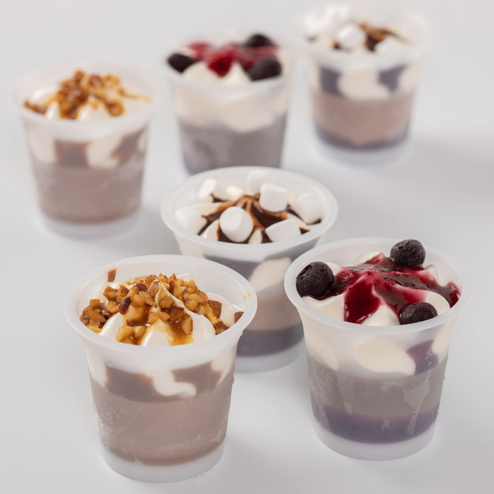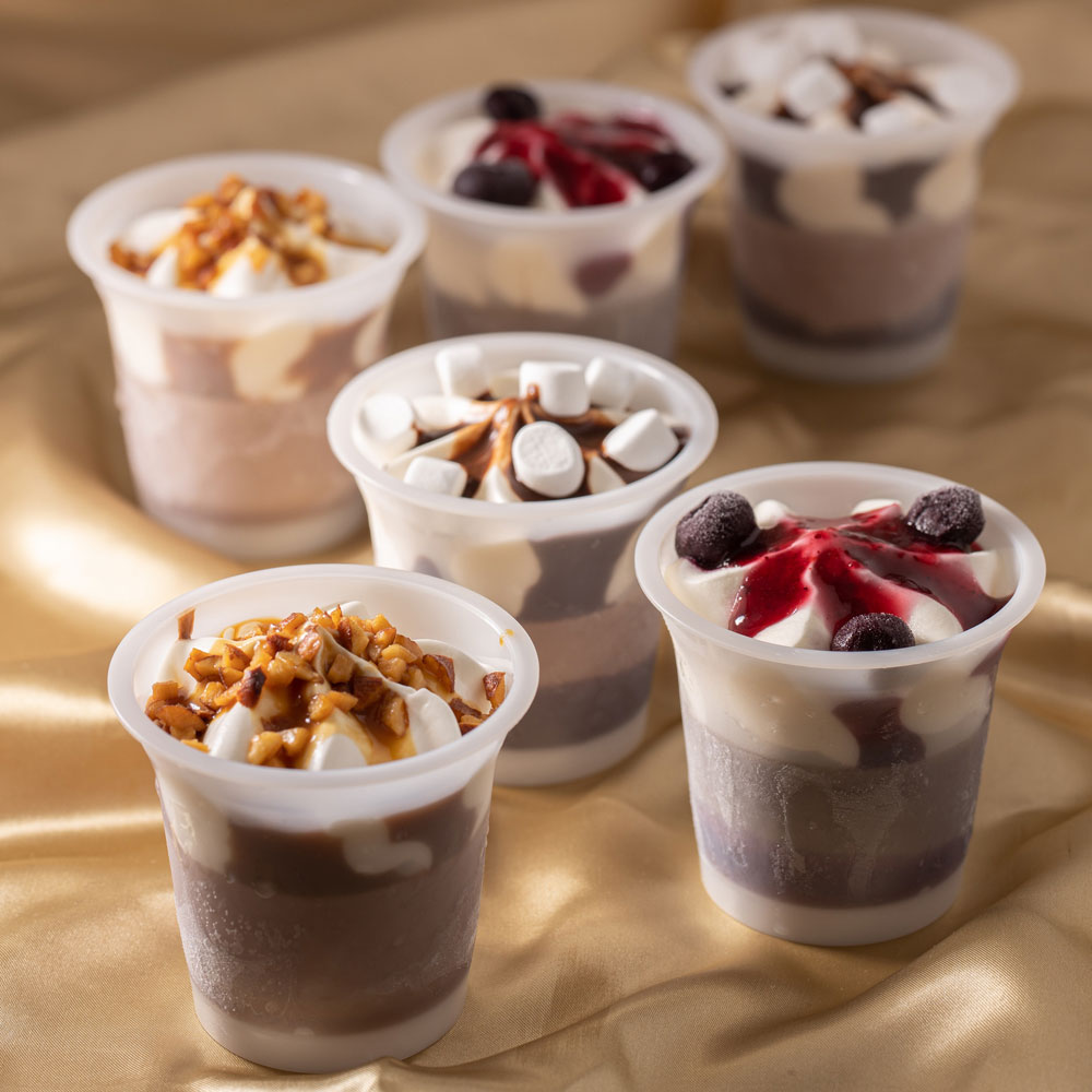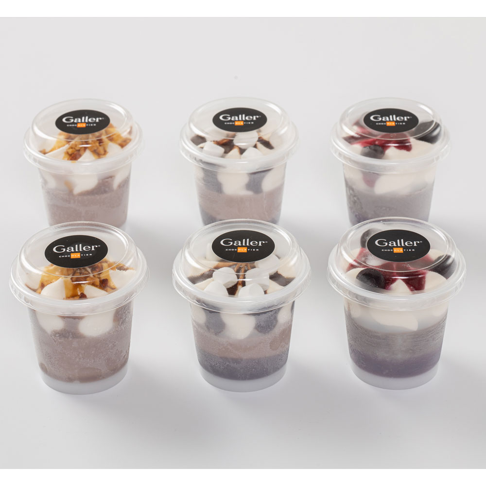 ベルギー王室ご用達「Galler」監修によるチョコレートアイスパフェ。3種類のチョコレートアイスにそれぞれ「ブルーベリー」「マシュマロ」「アーモンド」をトッピングしました。食べ進むにつれて味が変わる3層仕立てのアイスパルフェをお楽しみ下さい。