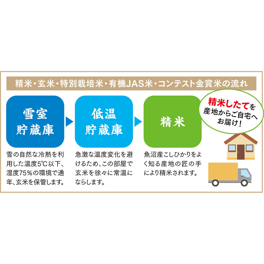 精米時も、急激な温度変化による劣化を防ぐため、一度低温貯蔵庫でならしてから、出荷直前に精米。倉庫保管を挟まず、精米したての状態で直送するので、「魚沼産こしひかり」が本来持つ旨み・甘み・香りをご堪能いただけます。