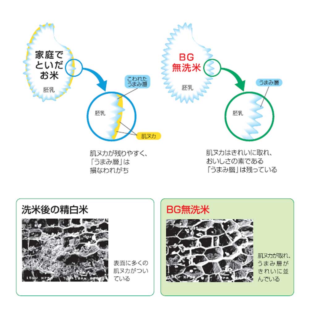 一般的なお米(精白米)は、玄米から胚芽と糠を取り除いていますが、実はお米の表面には粘着性のある「肌ヌカ」がまだ残っています。そのため、炊く前にお米をとぐ必要があります。本商品は、「BG精米製法」により、この肌ヌカをあらかじめきれいに取り除いているので、とがずにそのまま炊飯できてとても便利です!もちろん、お米本来の美味しさもそのまましっかり味わっていただけます。