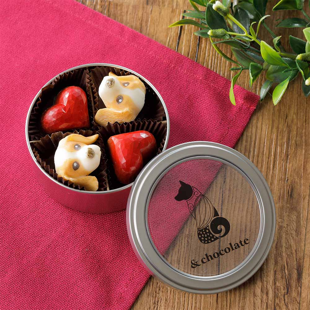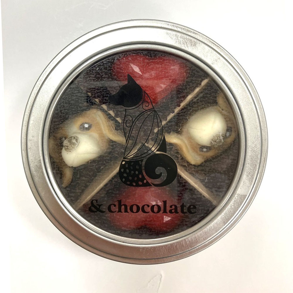 原料のチョコレートはベルギーで作られたこだわり品。1つ1つ手作業で表情をつけています。犬のチョコレートは犬がモチーフのロゴが入ったオリジナルデザインの缶に入れて、さらにお店のロゴ入りの紙袋を付けてお届けします。