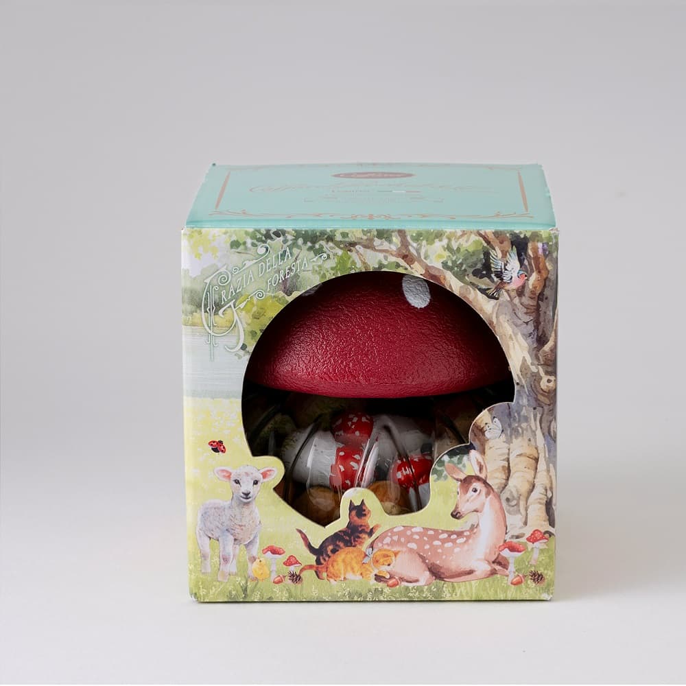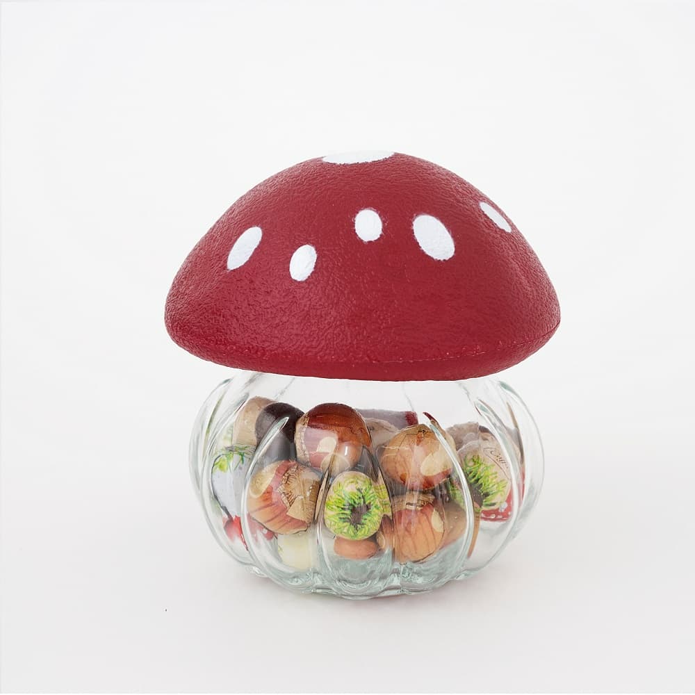 コロンとした可愛らしいきのこ型のポットに、きのこ、ヘーゼルナッツの2種をアソートしました。