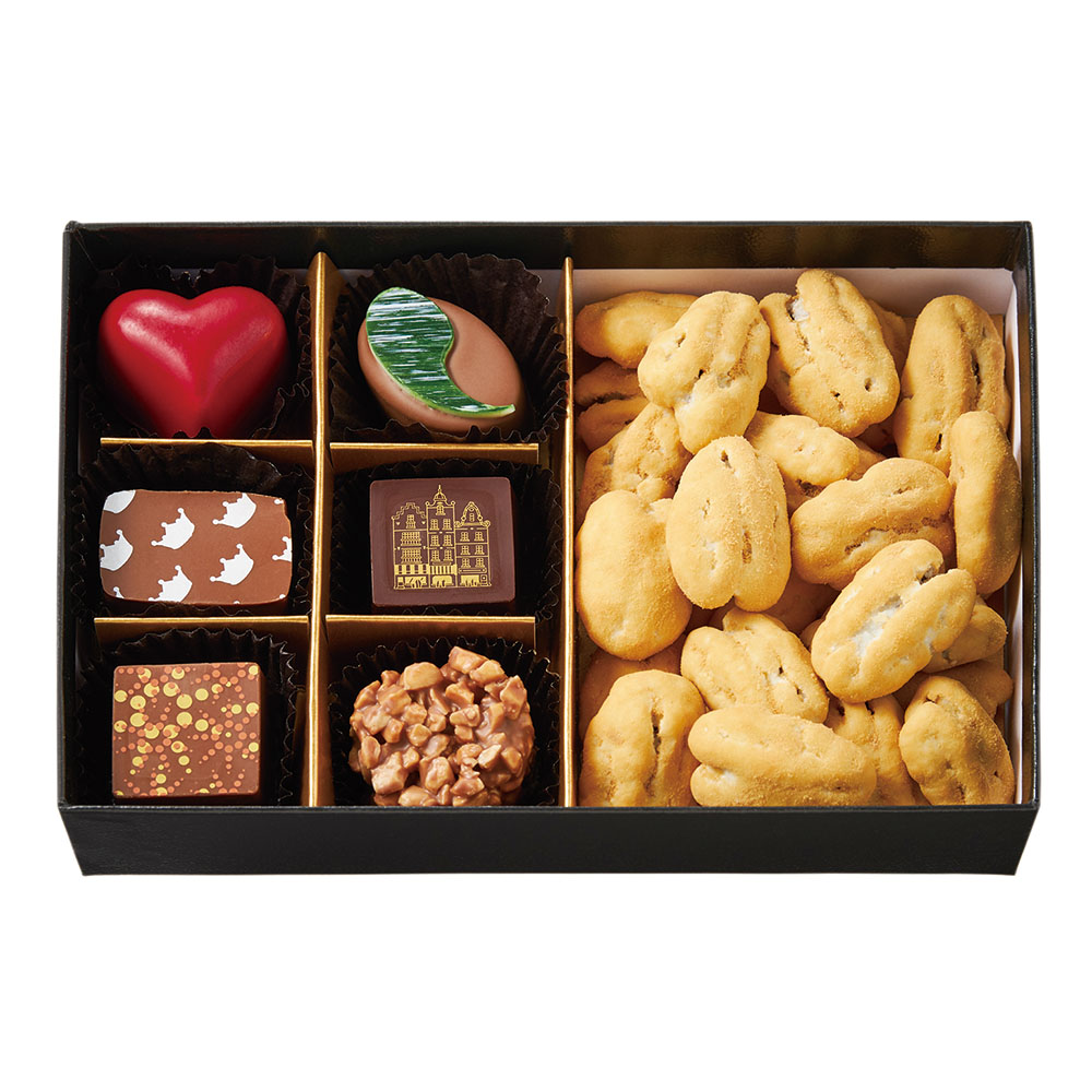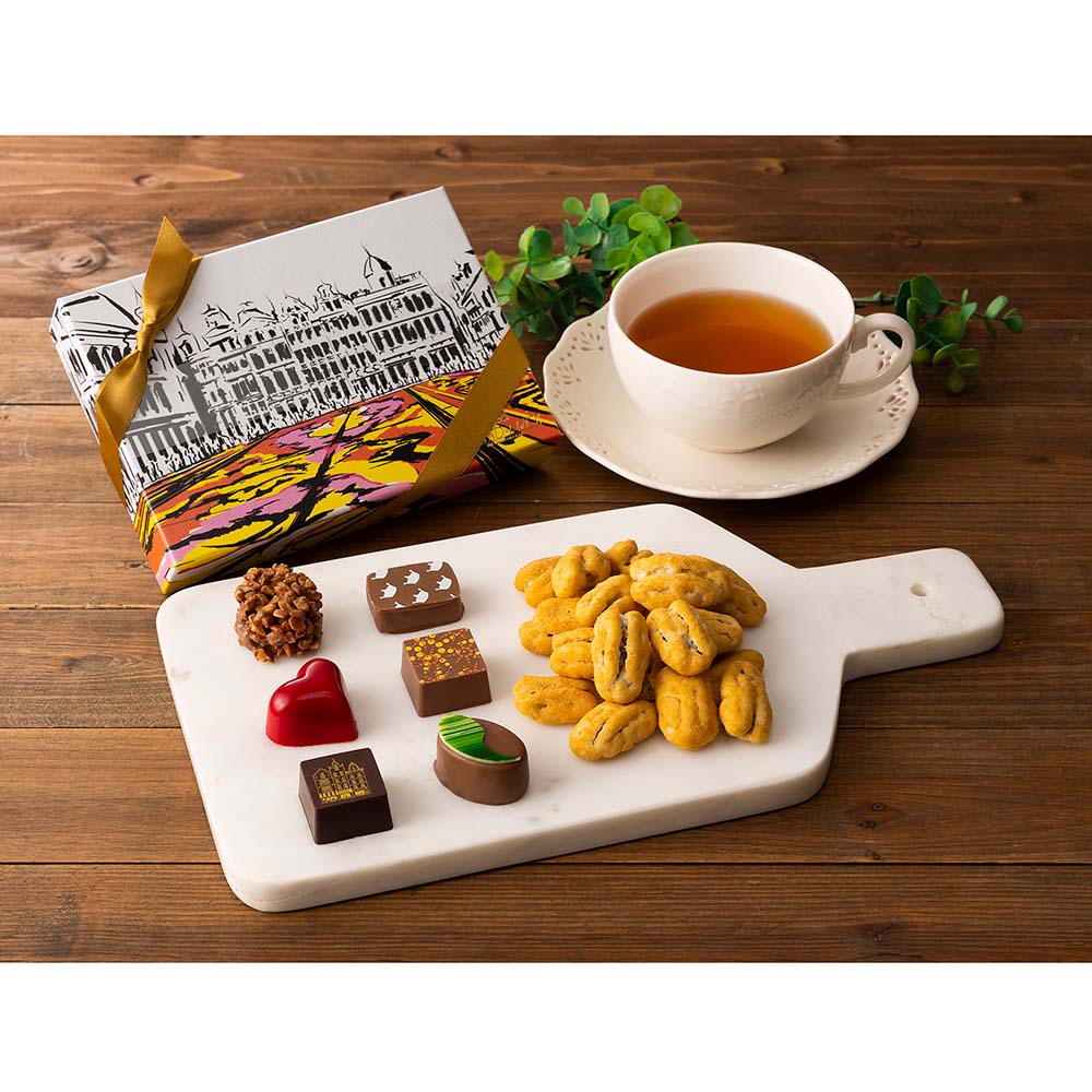 ■内容量:トリュフショコラ6粒(ティーハート、ミルクリッチ、マンゴーパッション、ピスターシュ、コアントロー、アマンドロッシェ)、ペカンナッツショコラキャラメル90g