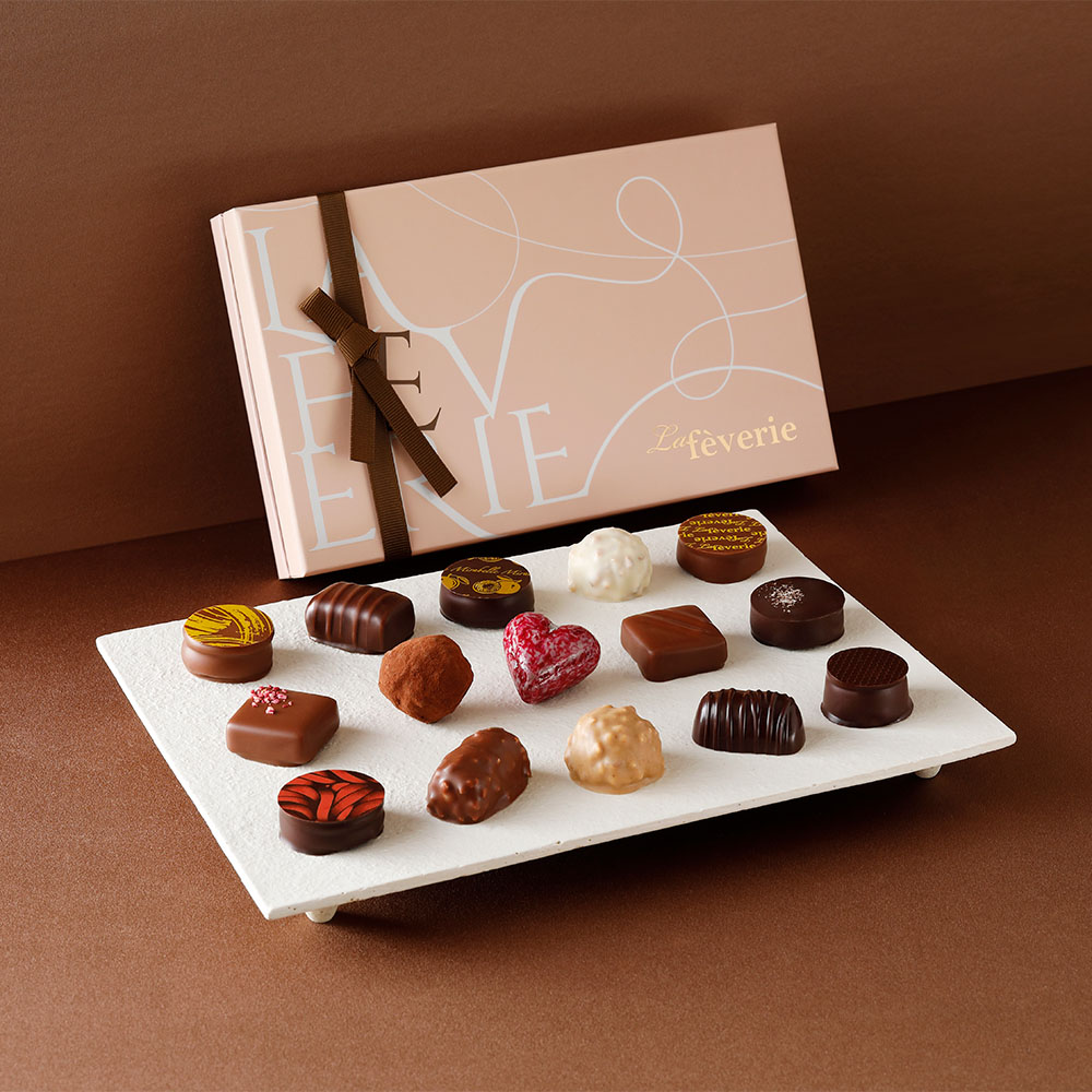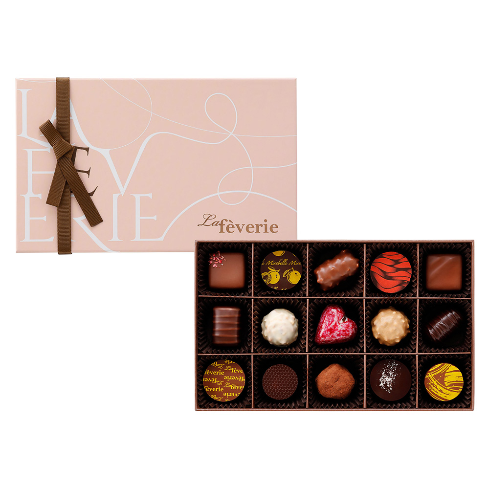 ラフェヴァリの代表作「トリュフショコラ」をはじめ、新作の「シトロン・ヴェール」「パレ・バナン」を含めた15種の詰め合わせ。