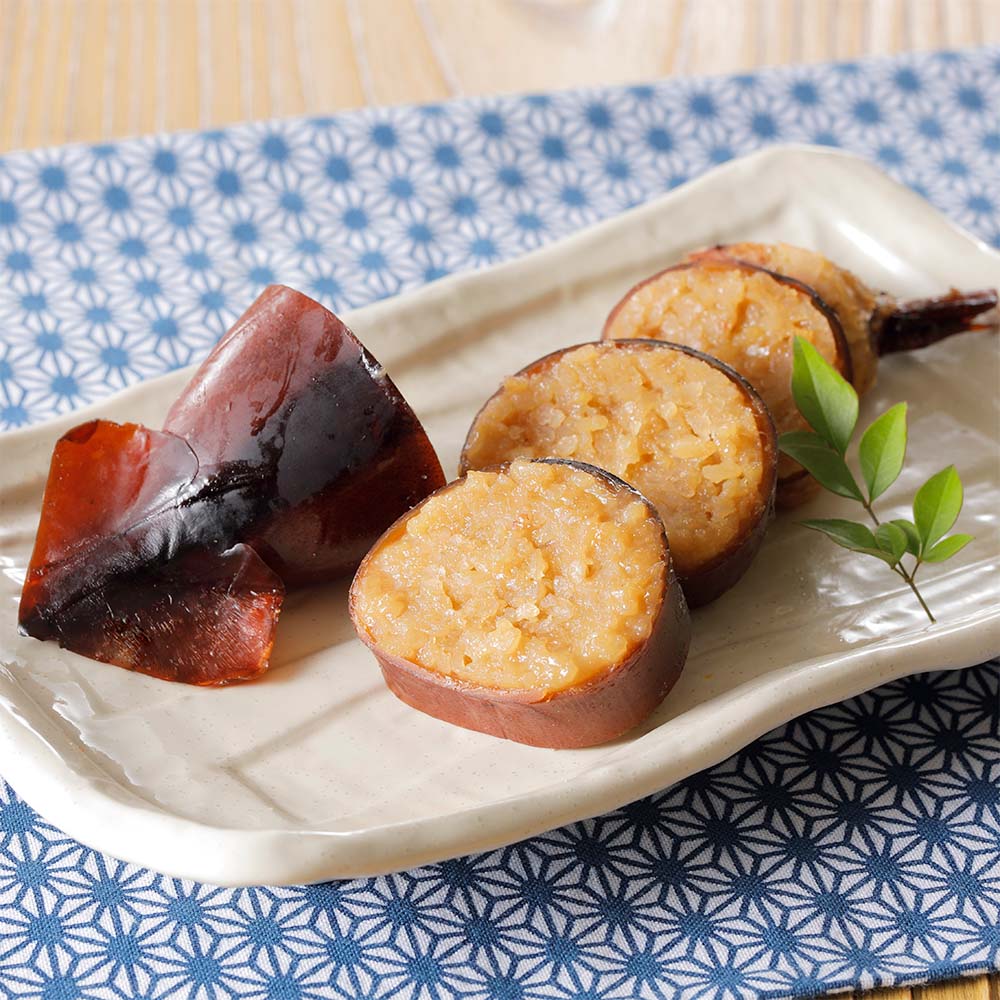 石川県産の新鮮なするめいか、もち米、うるち米を使い、まろやかな秘伝のタレでじっくり煮込んだ「能登 いかめし」。