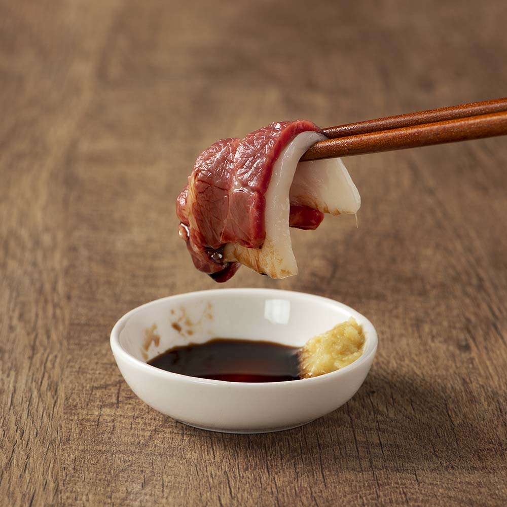 • コウネは赤身馬刺しと一緒に召し上がっていただく事で、馬肉のさっぱりとした甘みがより赤身馬刺しのうま味を引き立てます。