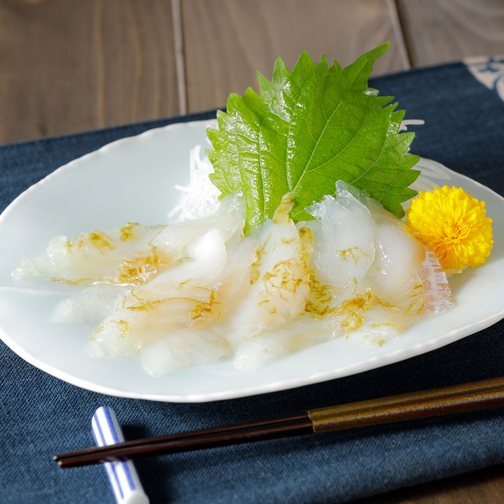 宮城県産のひらめ、真鱈、サメガレイを、北海道産の良質な昆布で丁寧に挟み込みました。魚介の身が締まり、ねっとりとした食感と深い旨味を楽しめる昆布〆のお刺身です。
