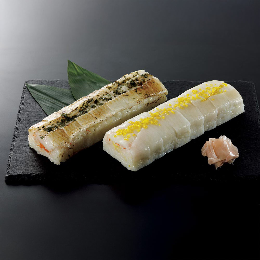 (左)炙りえんがわ寿司 (右)えんがわ寿司 ※本商品は炙りえんがわ寿司のみのお届けです