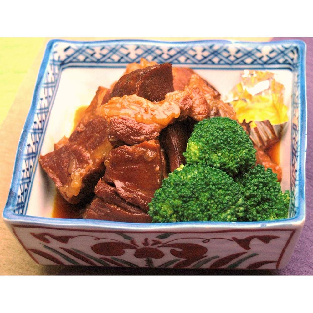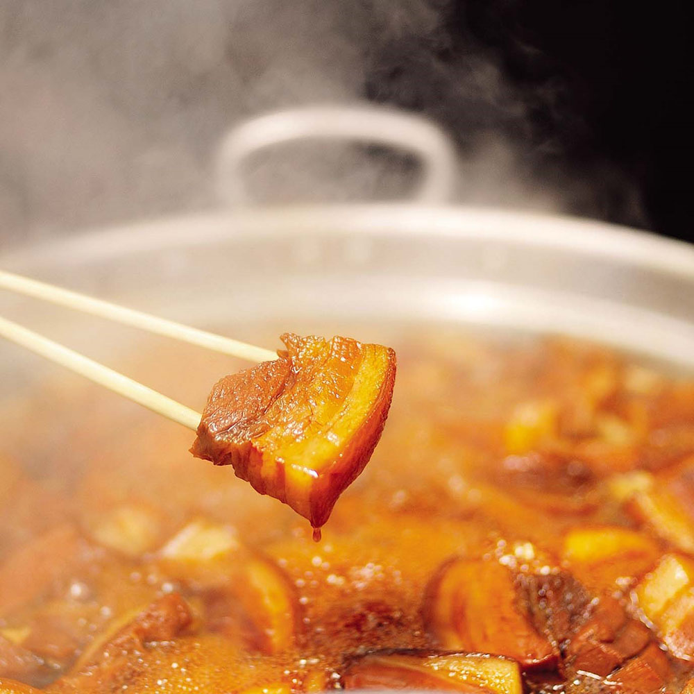厳選した豚肉の下茹でを何度も繰り返し、灰汁と余分な脂分を落とすことで脂身はゼラチン質となり赤身肉はやわらかくなりうまみだけが残ります。秘伝のたれを加えじっくり煮込みながら、その間にも灰汁を取り続け、肉の臭みを感じない良質な角煮に仕上げます。