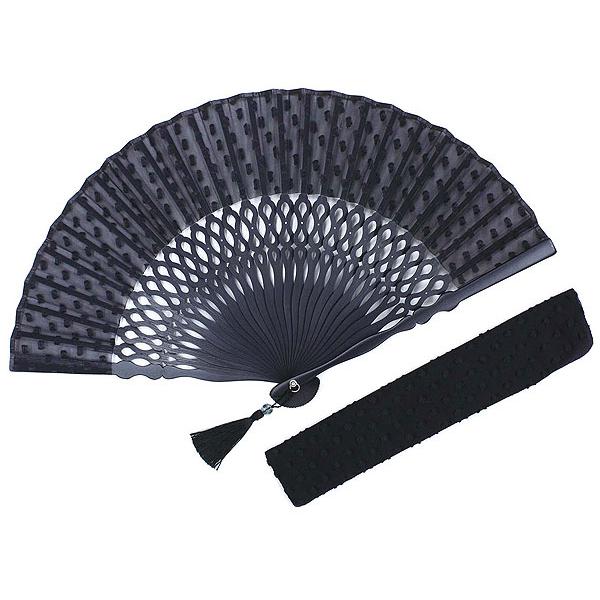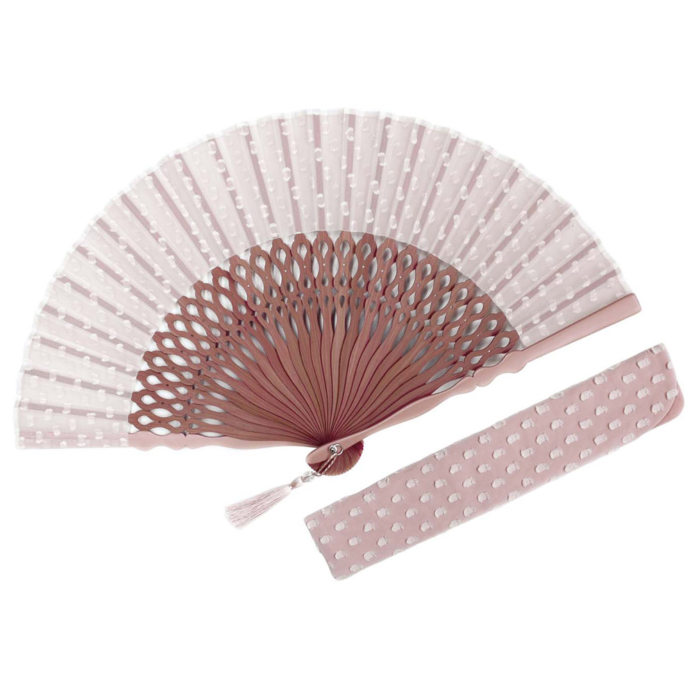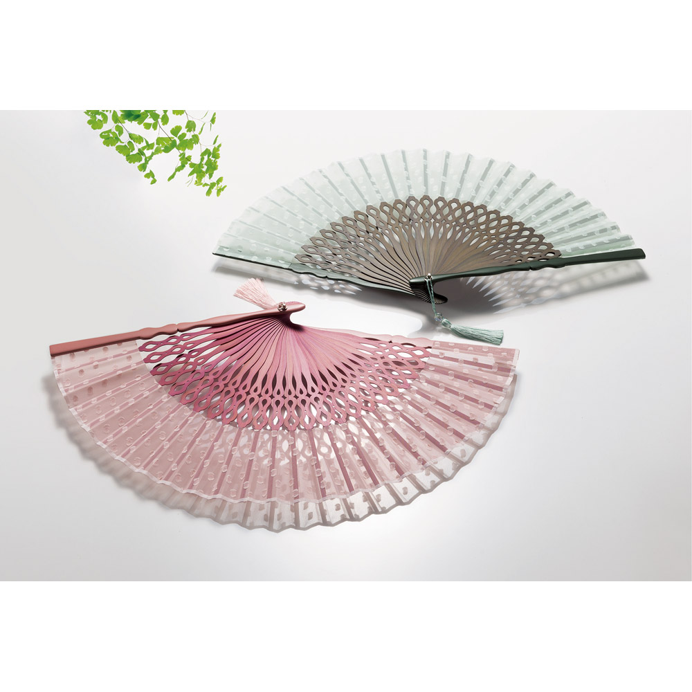 仲骨のシルエットが特徴的なシンプルモダンな扇子。ふんわりしたドット柄がやさしく女性らしい雰囲気に。レースのような扇骨が美しい、あおぐ姿も優美に見え、やわらかな涼風を運びます。