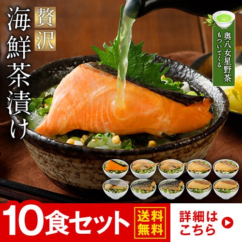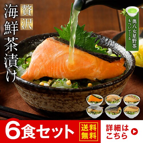 | 原材料/アレルギー | 鯛切り身:真鯛、食塩、こうじ調味料、魚醤 さば切り身:さば、食塩、こうじ調味料、魚醤(一部にさばを含む) 銀鮭切り身:銀鮭、食塩、こうじ調味料、魚醤(一部にさけを含む) ふぐ切り身:ふぐ、食塩、こうじ調味料、魚醤 お茶漬けの素:茶塩顆粒(食塩、でん粉、乳糖、昆布エキス、抹茶)、あられ、いりごま、焼海苔、みつば/調味料(アミノ酸等)(一部に乳成分・ごまを含む) 緑茶:緑茶 |