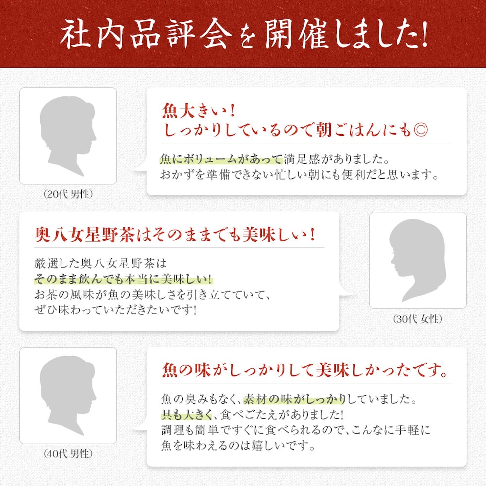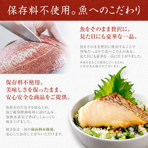 さば切り身:さば(ノルウェー)、食塩、発酵調味料、魚醤(一部にさばを含む) さわら切り身:さわら(韓国)、食塩、発酵調味料、魚醤 鯛切り身:真鯛(熊本県)、食塩、発酵調味料、魚醤 銀鮭切り身:銀鮭(チリ)、食塩、発酵調味料、魚醤(一部にさけを含む) ふぐ切り身:標準和名 しろさばふぐ(韓国)、食塩、発酵調味料、魚醤 お茶漬けの素:茶塩顆粒(食塩、でん粉、乳糖、昆布エキス、抹茶)(国内製造)、あられ、いりごま、焼海苔、みつば/調味料(アミノ酸等)、(一部に乳成分・ごまを含む) 緑茶:緑茶(福岡県) |