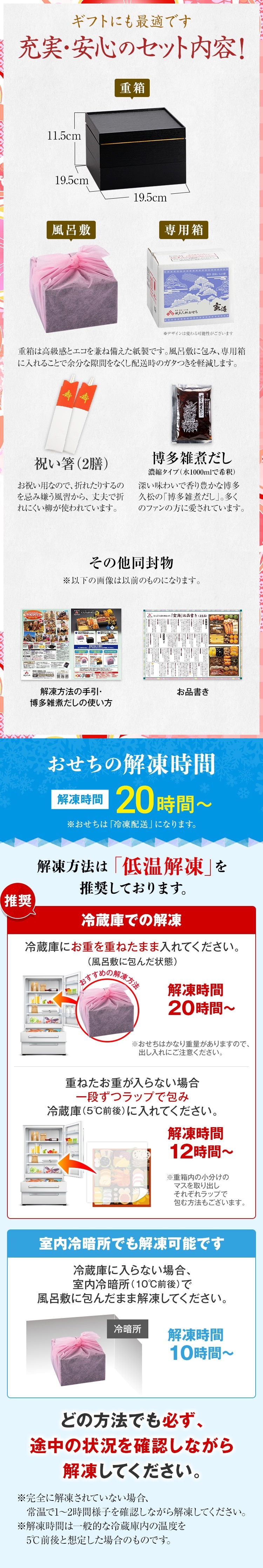 おせちは生ものです。日持ちのしない食材を含め、様々な具材がありますので開封後はできるだけ早めにお召し上がりください。