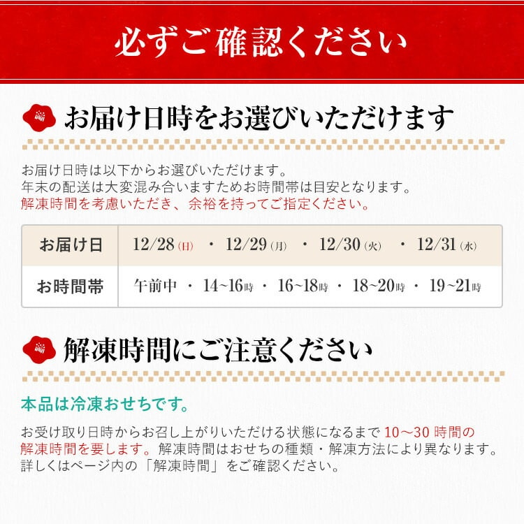 12月28日、12月29日、12月30日、12月31日のいずれか ご選択された日程にお届け予定 ※お届け日指定なしの場合は【12月30日着】指定といたします。 ※天候や交通事情等により、お届けに遅れが発生する場合がございます。あらかじめご了承ください。 ※配送状況は発送完了メールにてご確認ください。 |