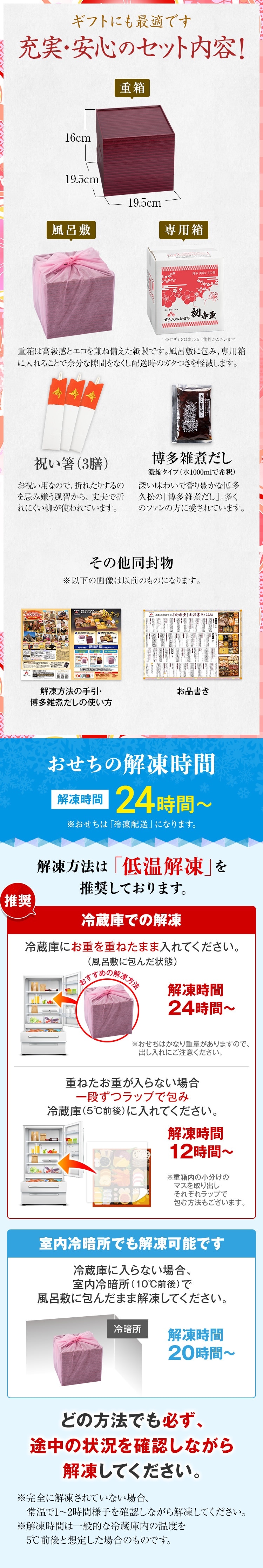 おせちは生ものです。日持ちのしない食材を含め、様々な具材がありますので開封後はできるだけ早めにお召し上がりください。