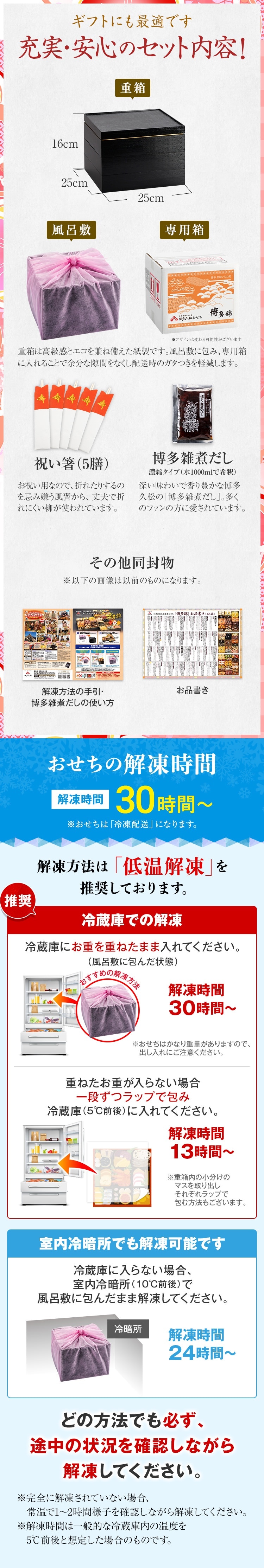 おせちは生ものです。日持ちのしない食材を含め、様々な具材がありますので開封後はできるだけ早めにお召し上がりください。
