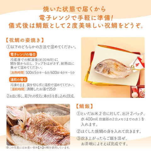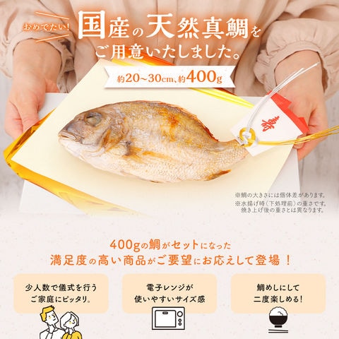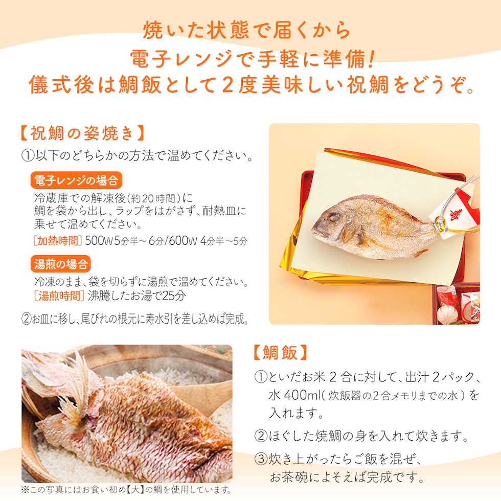 | 備考 | 祝鯛の姿焼き:水揚げ時 加工前 約400g 下処理 焼き加工後 約180g お食い初め重:283×133×73mm ※祝い箸のデザインは画像と異なる場合がございます。 ※鯛の大きさ・色については、個体差があります。 掲載画像と色味が異なる場合がございますので、あらかじめご了承ください。 ※ご注文について、当店からの確認後、不正購入と判断したご注文に関しましては、 ご注文を取り消しさせていただく場合がございます。 ご了承くださいませ。 |