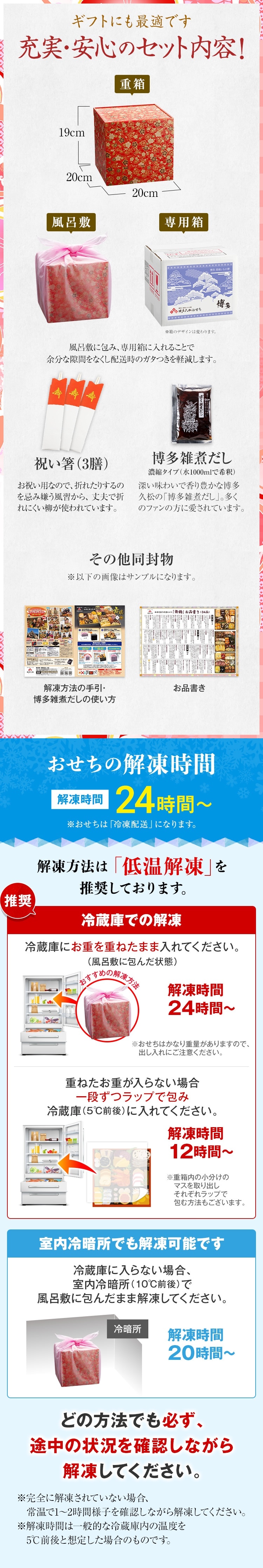 おせちは生ものです。日持ちのしない食材を含め、様々な具材がありますので開封後はできるだけ早めにお召し上がりください。
