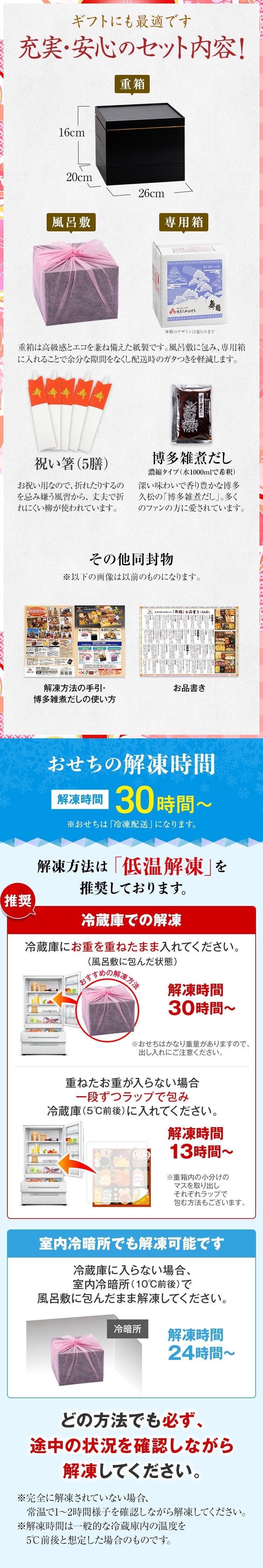 おせちは生ものです。日持ちのしない食材を含め、様々な具材がありますので開封後はできるだけ早めにお召し上がりください。