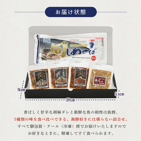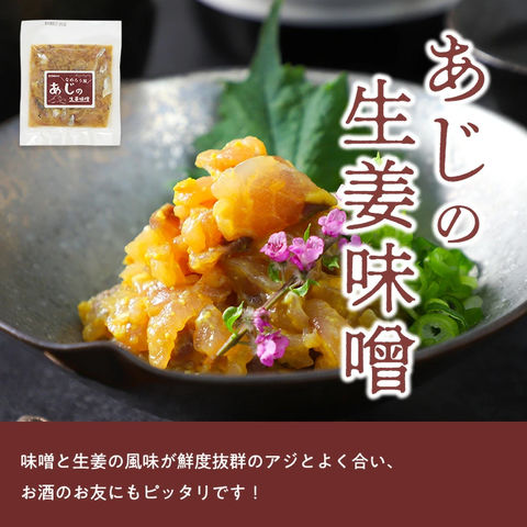 真あじ(長崎県産)、味噌漬け用調味料(味噌・砂糖・その他)、しょうが酢漬け(生姜、醸造酢)、魚醤(アンチョビ、食塩)/ 増粘剤(加工でんぷん、キサンタン)、(一部に小麦・大豆・オレンジを含む)
