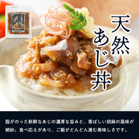 真あじ(長崎県産)、醤油、ごま、蛋白加水分解物、砂糖、味醂、食塩 / 調味料(アミノ酸等)、カラメル色素、酸味料、(一部に小麦・ごま・大豆を含む)