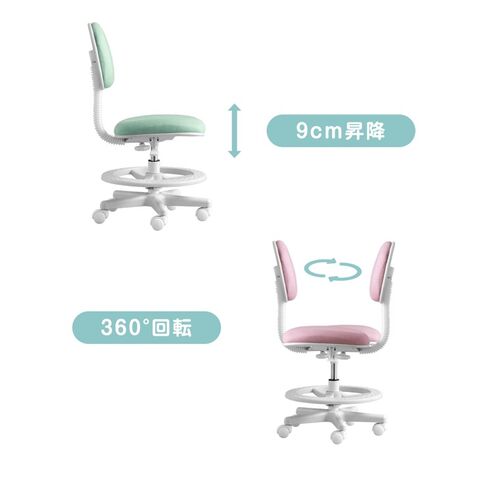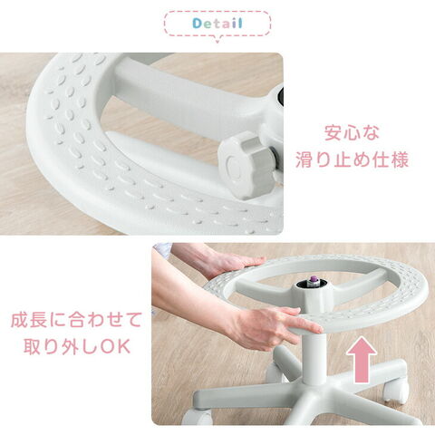 ・可愛らしいペールトーン×ホワイトフレーム ・お部屋に合わせやすいシンプルデザイン ・成長に合わせて、座面・足置きの高さ調節可能 ・背もたれスライド調節で勉強しやすい姿勢に ・足置きリングは安全・安心の滑り止め仕様 ・成長に合わせて足置きリングは取り外しOK ・オールシーズン快適 ファブリック ・床を傷付けにくいPUキャスター |