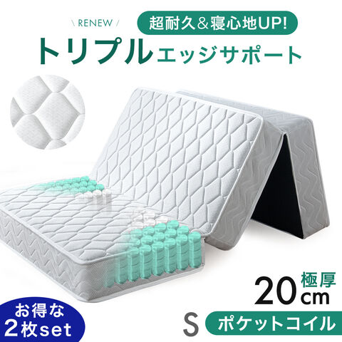 【即納】 【お得な2枚組】 RENEW 寝心地UP 三つ折り ポケットコイル マットレス 極厚20cm シングル トリプルエッジサポート 体圧分散 メッシュ 通気性 高反発 ウレタン ベッド マット 3つ折り 折り畳み 圧縮 05191003〔ホワイト〕