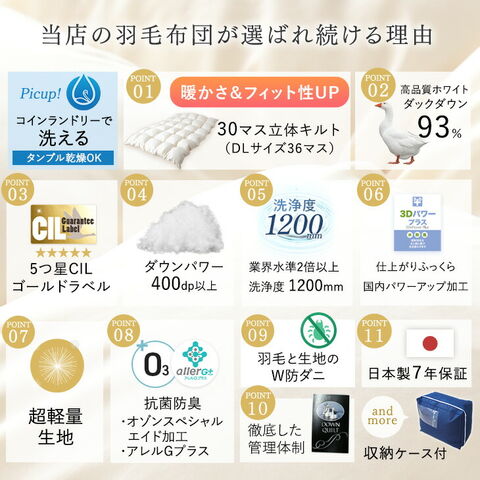 | ・5つ星 CILゴールドラベル取得 ・フィット感アップ30マス立体キルト(D/Q:36 K:42マス) ・ホワイトダックダウン93% ・丁寧に仕上げた日本製 ・かさ高165mm以上、ダウンパワー400dp以上 ・国内パワーアップ加工でふっかふか! ・SEK認定のアレルGプラスで抗菌効果 ・除菌・防ダニ・防カビ オゾンスペシャルエイド加工 ・ダニの侵入を防ぐ 高密度生地 ・コインランドリーで丸洗い&乾燥OK! ・側地はピーチスキン加工でなめらかな肌触り ・羽毛の抜け出しを防止するダウンプルーフ加工 ・羽毛の膨らみを妨げない超軽量生地 ・保温力UP 立体キルト ・安心の7年保証 ・93万人にお届けした信頼と実績 ドリームダウン ・古い羽毛を無料回収 |