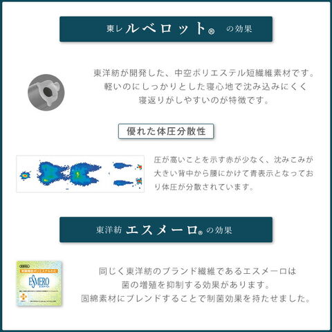 | 【側地】綿100%(SEK) 【中綿】 (秋冬面)ペガサスウール、マイティトップ2(約1.5kg) (春夏面)帝人アクフィットECO(ポリエステル綿)100%(1.5kg) 【固綿】 ルベロット+エスメーロ(ポリエステル100%)(約3kg) 【詰め物重量】約6kg |