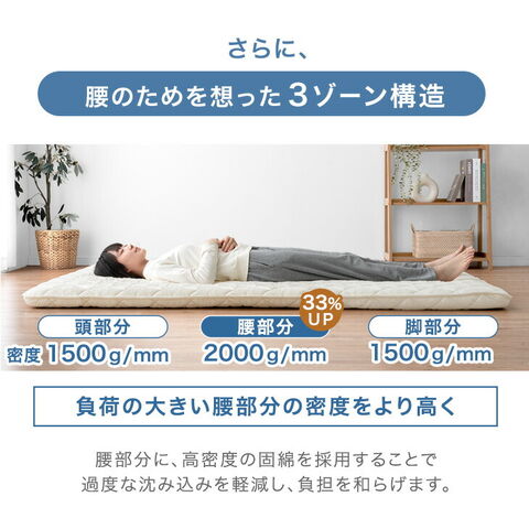 【即納】 腰想い。 3ゾーン構造 敷布団 日本製 固綿 防ダニ 抗菌 防臭吸汗 速乾 敷き布団 シングル ルベロット 敷布団 綿100% 極厚 厚い 国産 硬め 3層 敷ふとん マットレス 来客用 軽量 高反発 布団 固わた 11156756