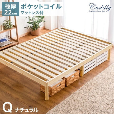高さ調節 すのこベッド マットレス付 クイーン フレーム ベッド すのこ ローベッド 木製 ベット ベッドフレーム クイーンベッド 北欧 シンプル すのこベット ポケットコイル マットレス ポケットコイ 11719177〔ナチュラル+(マットレス)ブラック〕【予約】2月中旬※2/20までに出荷予定