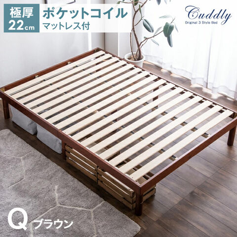 高さ調節 すのこベッド マットレス付 クイーン フレーム ベッド すのこ ローベッド 木製 ベット ベッドフレーム クイーンベッド 北欧 シンプル すのこベット ポケットコイル マットレス ポケットコイ 11719177〔ブラウン+(マットレス)ブラック〕【予約】2月中旬※2/20までに出荷予定