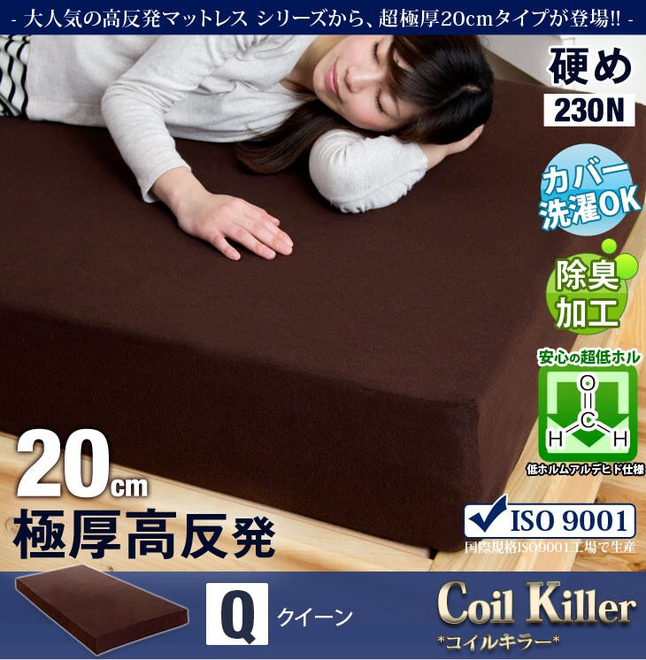 【即納】 超極厚20cm 「純」高反発(R) マットレス クイーン 一体型 へたりにくい 高密度30D 硬め 230N 安心エコテックス 超低ホル 高反発マットレス 20cm厚 高反発マット 折りたたみ 折り畳み 洗える カバー 13810107〔ブラウン〕