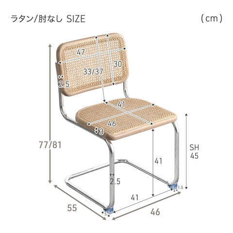 | サイズ | 肘なしレザー:幅47x奥行56x高さ73/79cm(座面高:49cm) 肘なしラタン:幅47x奥行55x高さ77/81cm(座面高:45cm) 肘付きラタン:幅58x奥行55x高さ77/81cm(座面高:45cm) |