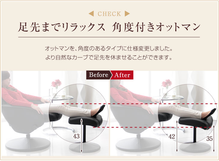 | [チェア詳細サイズ]外寸:幅71.5×奥行80~115×高さ8~102cm座面の高さ(SH):44cm肘掛の高さ:57cm[オットマン詳細サイズ]外寸:幅44×奥行40×高さ43cm |