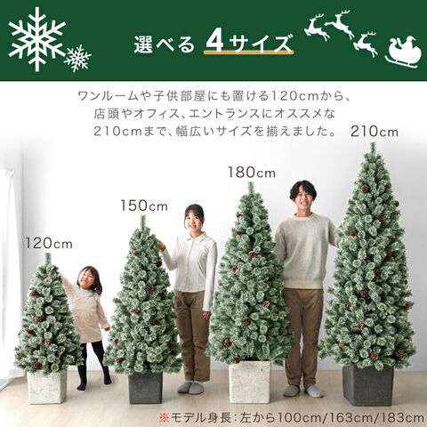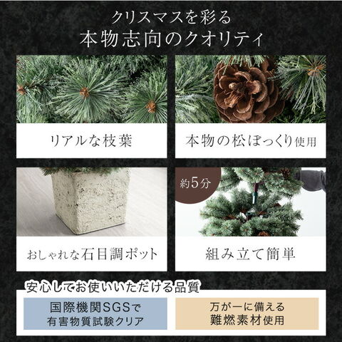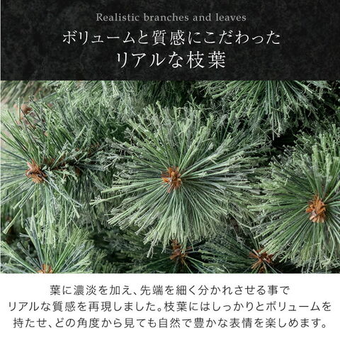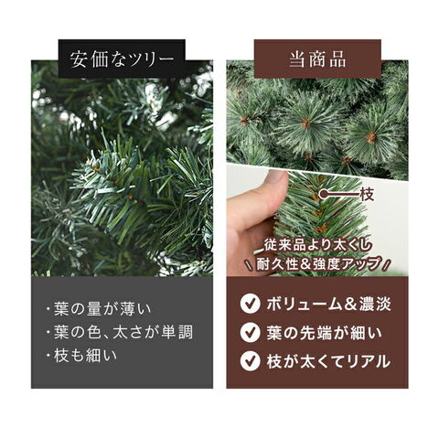 | 重量 | 120cm:ツリー約5kg/ポット約3kg 150cm:ツリー約7kg/ポット約3kg 180cm:ツリー約9kg/ポット約4kg 210cm:ツリー約11kg/ポット約4kg |