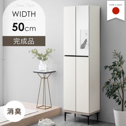 国産 完成品 シューズボックス ミラー付き 幅50 ハイタイプ 消臭機能付 姿見 大容量 洗える 可動棚 収納 靴入れ 靴箱 玄関収納 靴収納 下駄箱 シューズラック モルタル【超大型】 17010108〔ミルクアイボリー〕