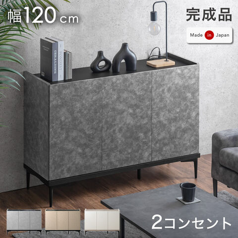 日本製 モルタル調 キャビネット 2口コンセント付 幅120cm 完成品 脚付き サイドボード ローボード サイドチェスト 収納棚 北欧 おしゃれ 国産 大川家具【超大型】17010111〔モルタルブラック〕