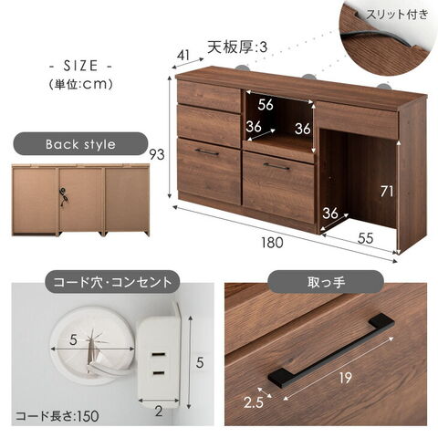 表面材:強化紙 天板:強化紙化粧繊維板 引き出し内部:垣板・手前板・向板…ファルカタ材 底板…プリント化粧繊維板 取っ手:アルミダイキャスト製 |