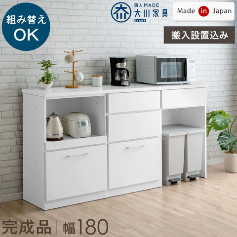 【搬入設置込み】組み替えOK キッチンカウンター 完成品 幅 180 食器棚 収納 キッチンボード レンジ台 キッチンラック カウンター キッチン収納 ゴミ箱 ダストボックス 180cm 日本製 木製 おしゃれ【超大型】 99901215〔ホワイト〕【予約】2月中旬※2/20までに出荷予定